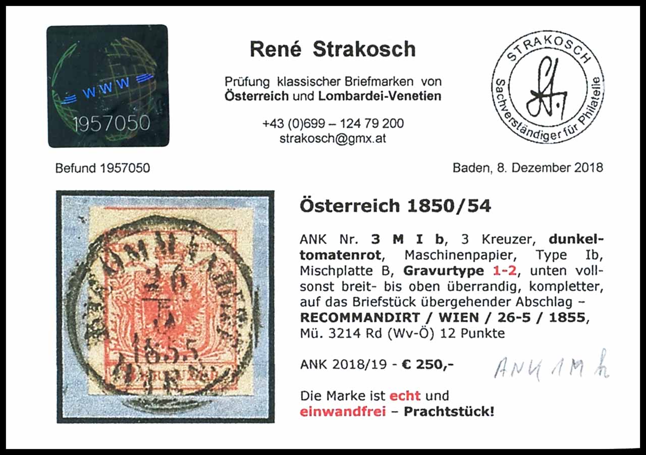 3 Kreuzer coat of arms design, dark red, machine paper, Ferchenbauer type Ib mixing plate B, engraving type 1-2, on all sides full margins, on small letter piece cancelled by complete strike of a postmark "registered Vienna 26-5 1855", very fine, photo expertize Rene Strakosch "genuine and immaculate", ANK 200.-