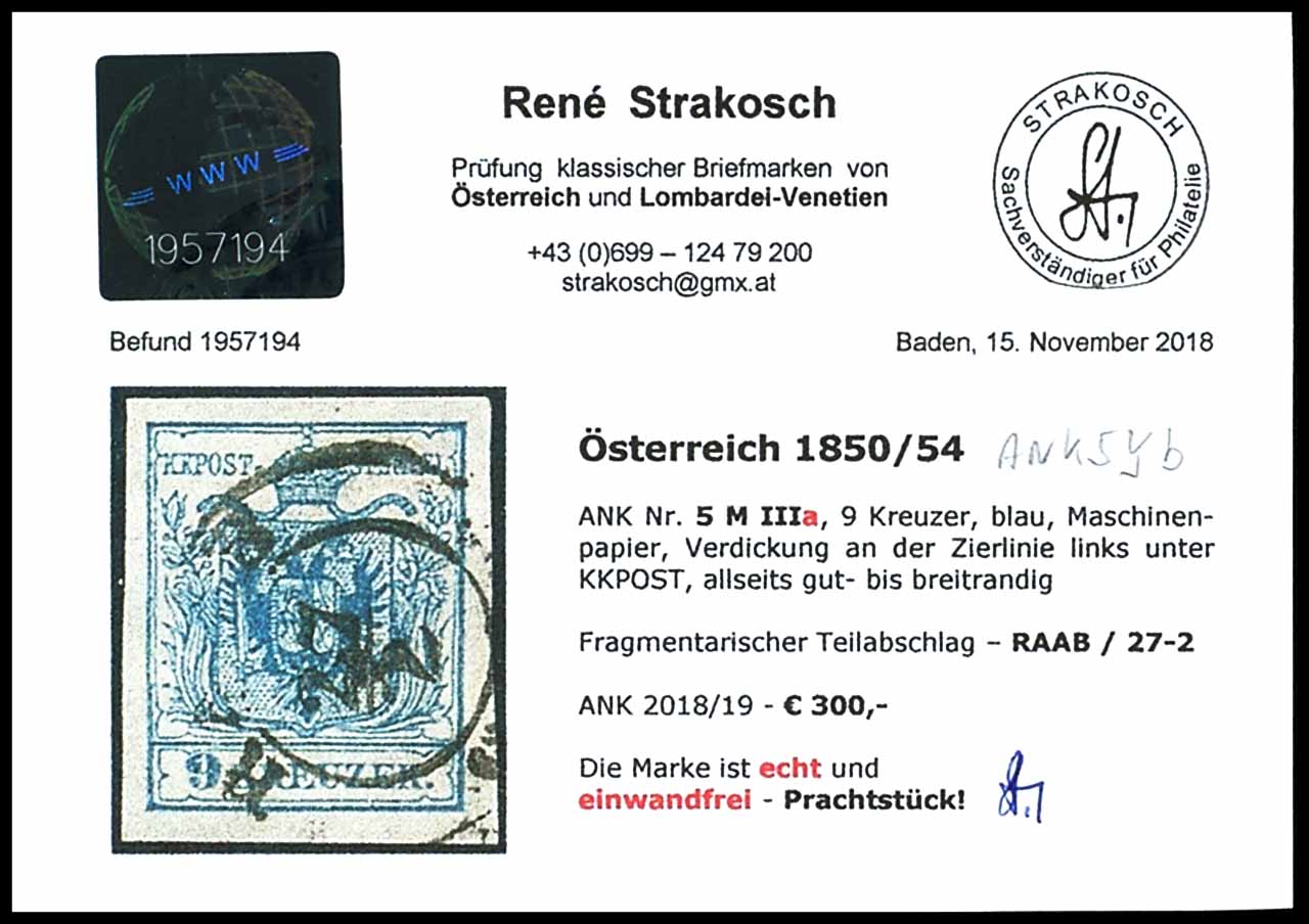 9 Kreuzer crest issue, 1854, machine paper, colour shade blue, ANK number 5 M IIIa b, type IIIa, cancelled by partial cancel from "RAAB / 27-2", on all sides full margins, fresh colours copy, signed, photo expertize Rene Strakosch (2021) "genuine and immaculate", ANK 300.-
