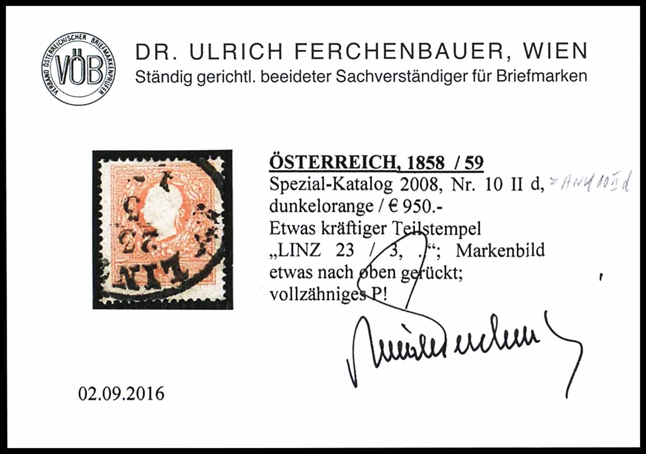 2 Kreuzer emperor head left, type II, dark orange, to the top off-center, perfect perforations, cancelled by strong partial cancel "LINZ 23 / 3. ", expertized Ferchenbauer, photo expertize Dr. Ulrich Ferchenbauer VOEB (2016), ANK 1.100.-