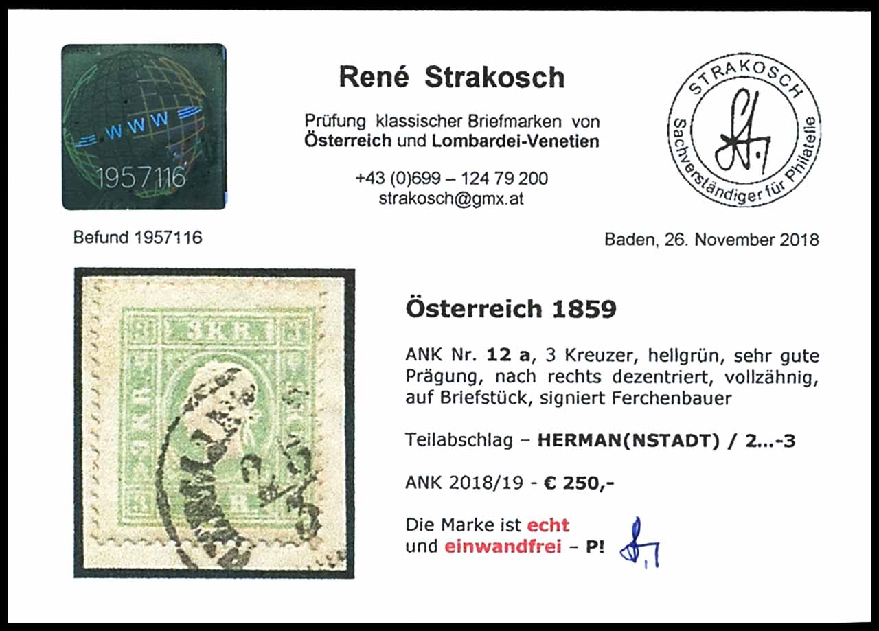 3 Kreuzer emperor head left, type II, light green, to the right off-center, perfect perforations, cancelled by part of postal imprint "HERMAN (NSTADT) / 2.3", turning into on a small letter piece, expertized Ferchenbauer, photo expertize Rene Strakosch (2018), Michel 250.-