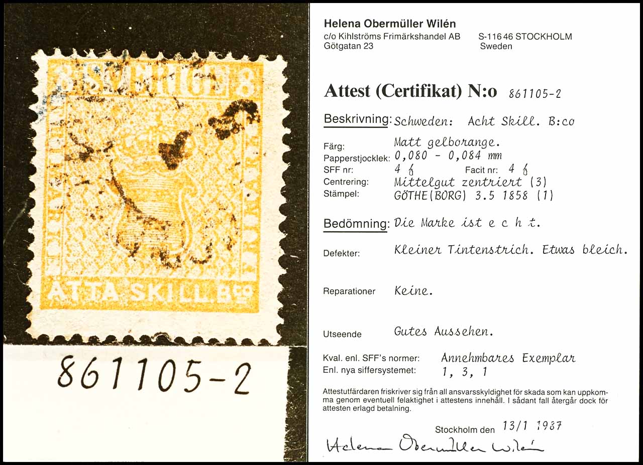 8 Skilling Banco, empire crest, only sheet margin watermark, perforated K 14, dull yellow orange, cancelled by partial cancel "GOETHE (BORG) 3.5.58", mittelgut centered, small ink line left above in the corner, excellent condition, certificate Helen Obermueller Wilen, Michel 1.400.-