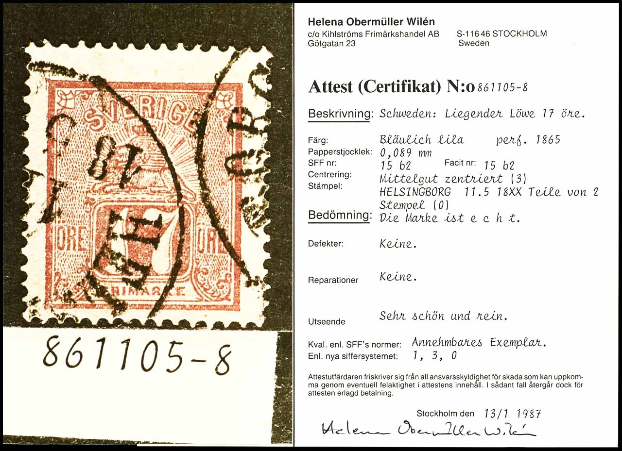 17 oere, small lion over numeral of value, bluish lilac, cancelled "HELSINGBORG 11.5 18. ", very fine, signed Richter, certificate Helen Obermueller Wilen (1987), Michel 140.-