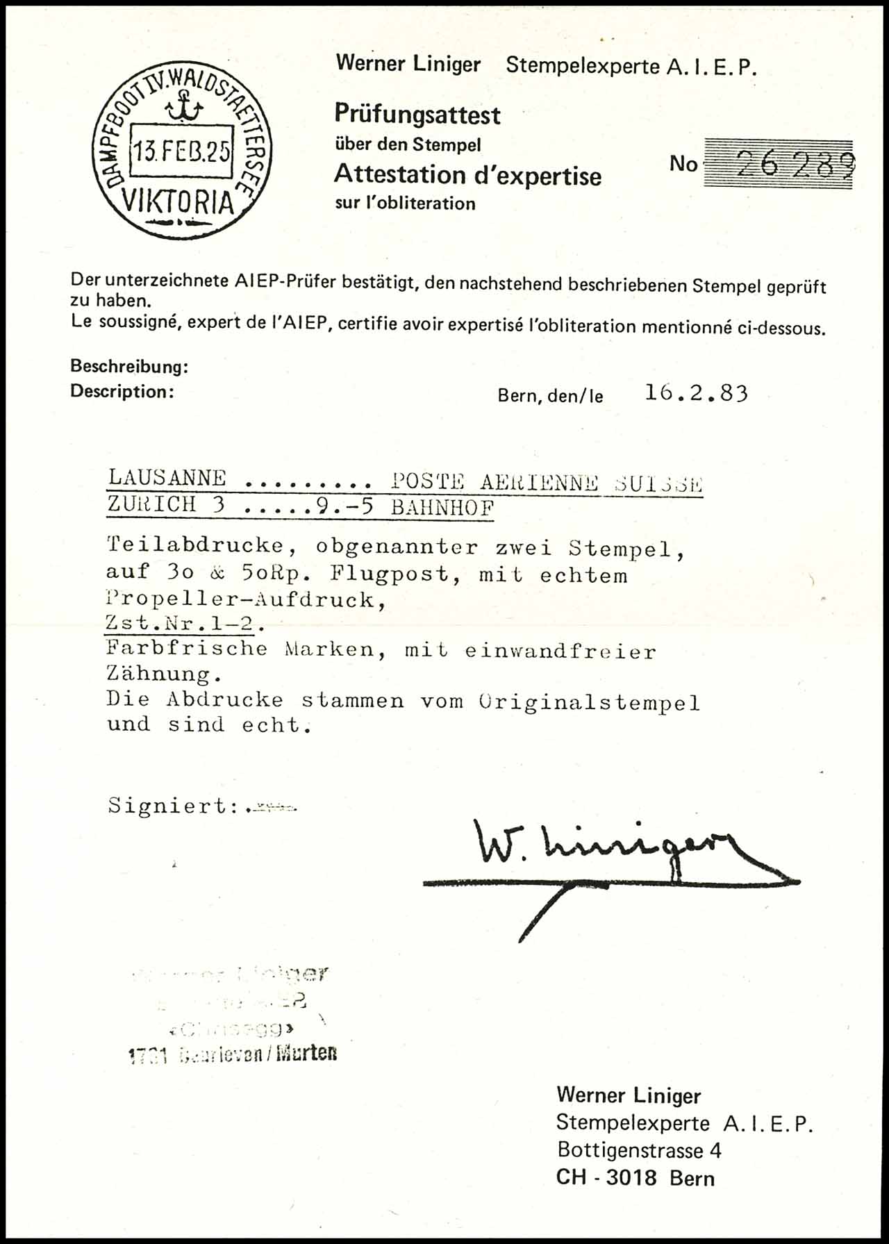 30 Centimes and 50 Centimes airscrew overprint, airmail items 1919-1920, neat cancelled, both stamps signed, certificate Werner Liniger International Association for Philatelie Experts (1983) "fresh colours stamps, with perfect perforation, the impressions comes from original postmark and are genuine", Michel 1.540.-