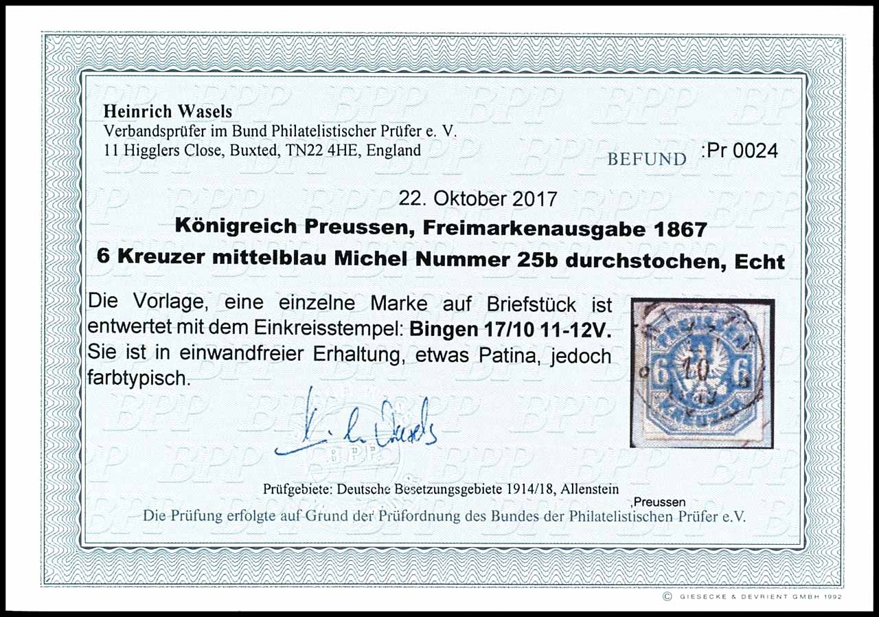 6 Kreuzer medium blue, fresh-color cabinet piece, cancelled with a single-circle postmark BINGEN 10 / 7 on a fragment of a letter, photographic finding by Heinrich Wasels BPP: "excellent condition, slight patina, but typical color."