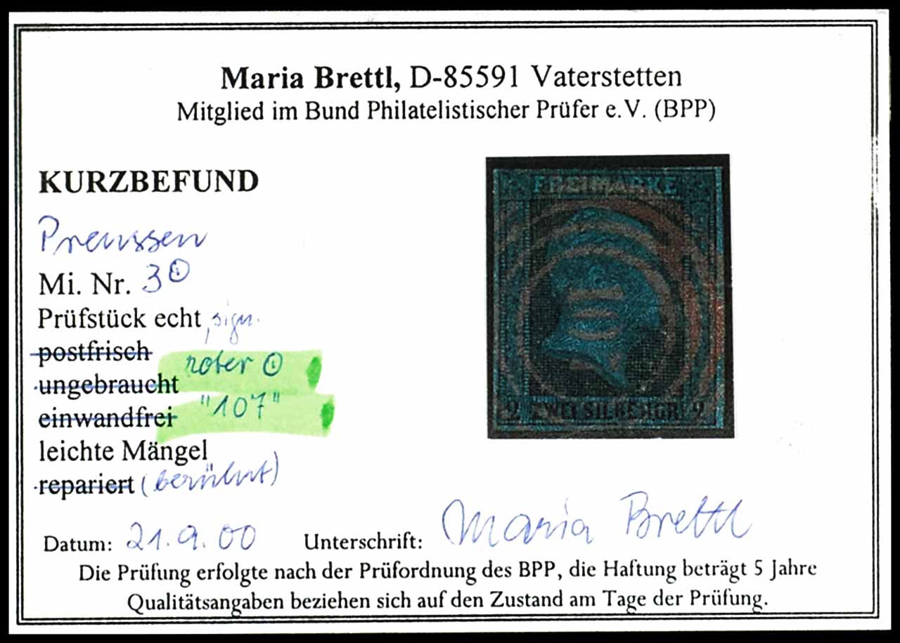 107 - Berlin, Postal Dispatch No. 4 (Administrative District of Potsdam), clear and centrally struck, red postmark on 2 silver groschen black on blue, touched at the top - otherwise flawless condition, photo certificate Maria Brettl BPP