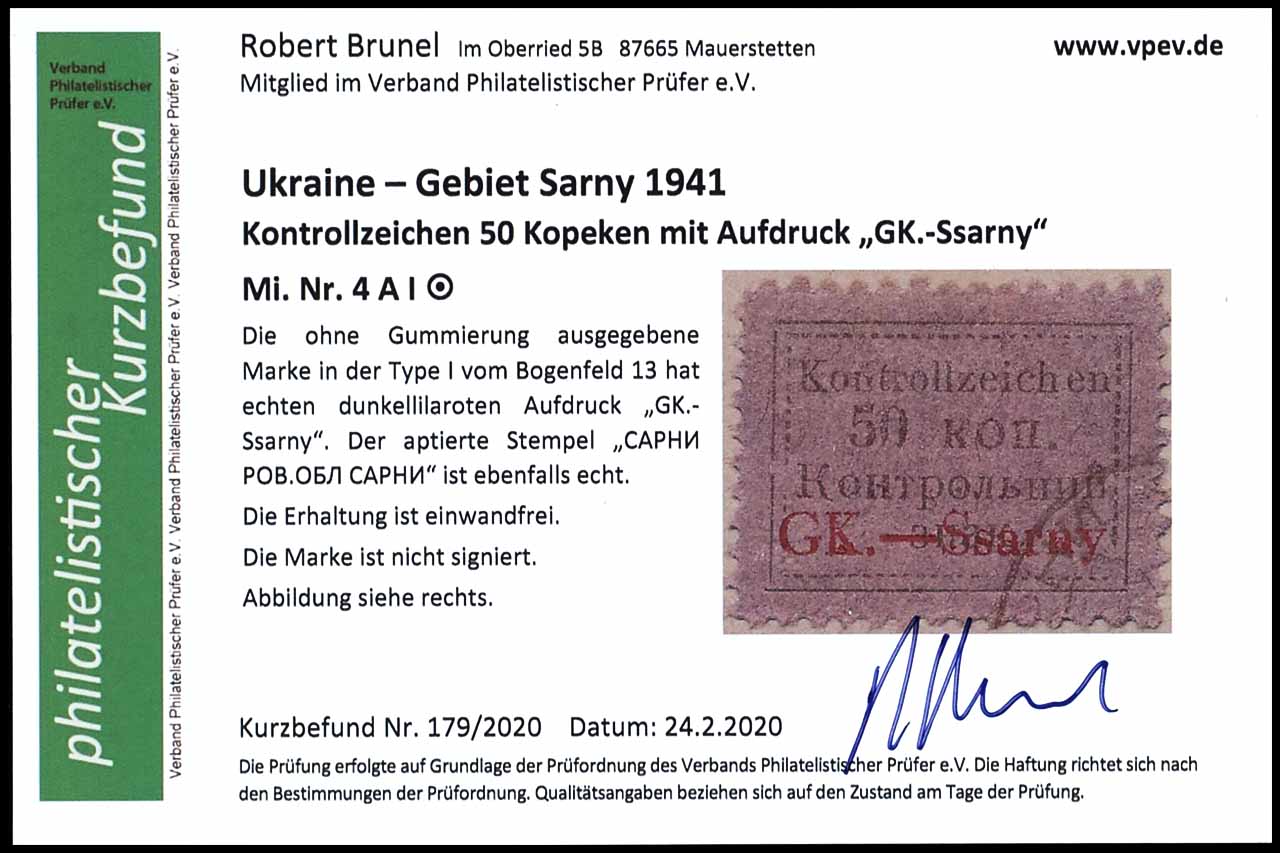 50 Kopek postage stamp with dark reddish-brown typography overprint "GK.-Sarny", sheet block 13 with overprint type I, used, flawless condition, photographic finding by Robert Brunel "The condition is impeccable.", Michel 160.-