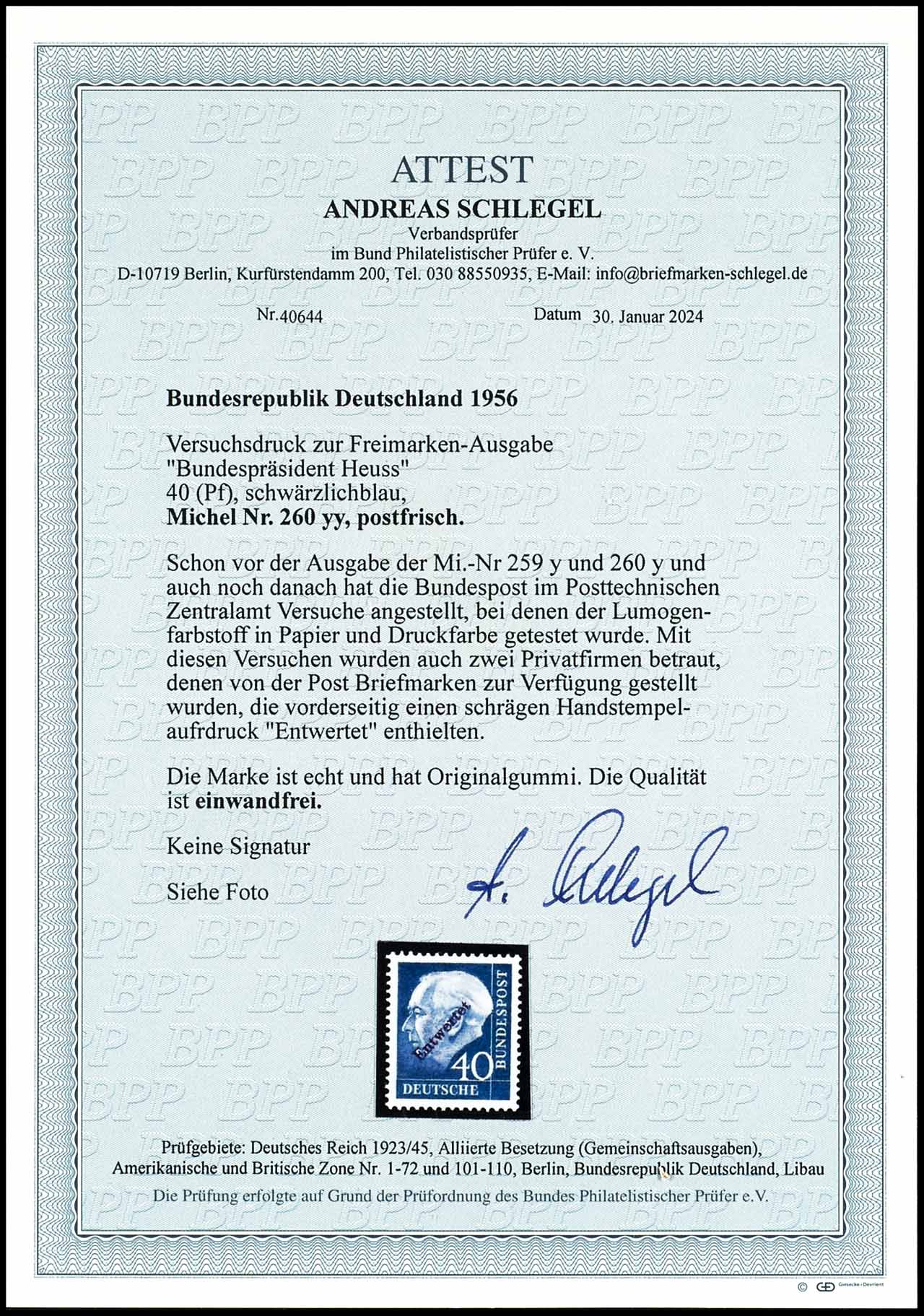 40 Pfennig Heuss on fluorescent paper in a different color, dark bluish-blue, with hand-applied postmark "Entwertet" (devalued), produced for experimental purposes in 1960. mint never hinged, flawless condition, photo certificate Andreas Schlegel BPP (2024) "The quality is impeccable.", Michel 1.000.-