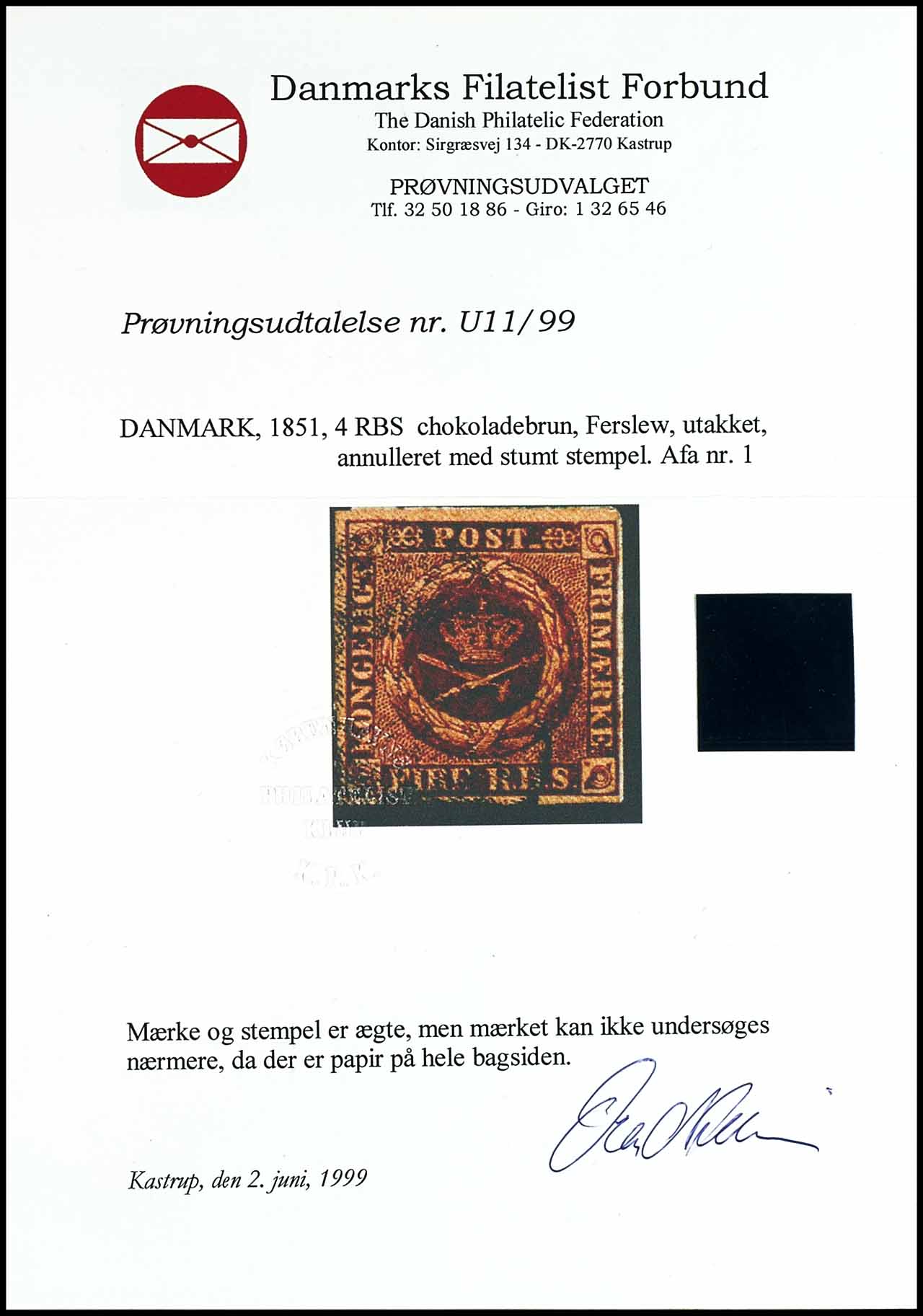 4 S, chestnut brown, all sides with full margins, fresh color and flawless strike, photo certificate from Danmarks Filatelist Forbund.