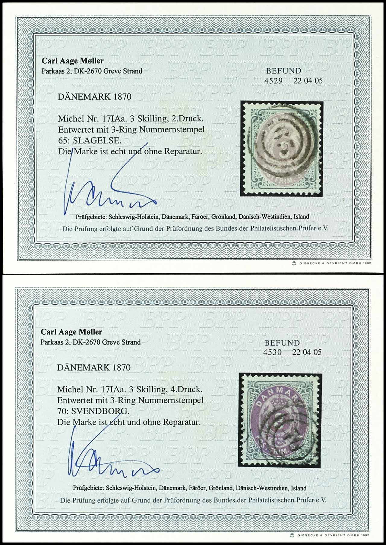 3 mint stamps from the 2nd printing with a 3-ring postmark 65 "SLAGELSE" and 3 mint stamps from the 4th printing with a 3-ring postmark 70 "SVENDBORG", both in excellent condition and with photographic evidence by Aage Moeller BPP.