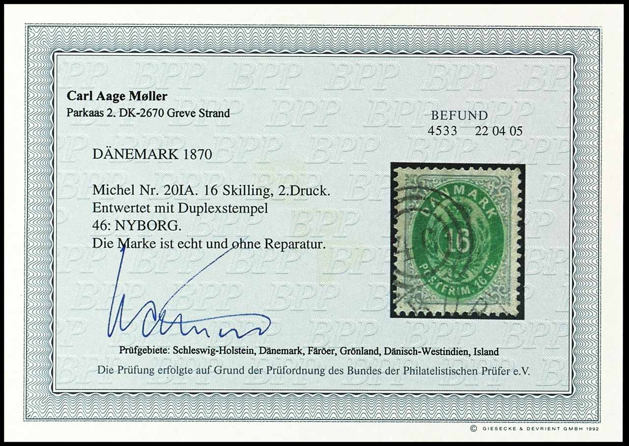 16 mint grey / green, flawless, clearly postmarked with duplex stamp number 46 "NYBORG", photographic certificate by Aage Moeller BPP