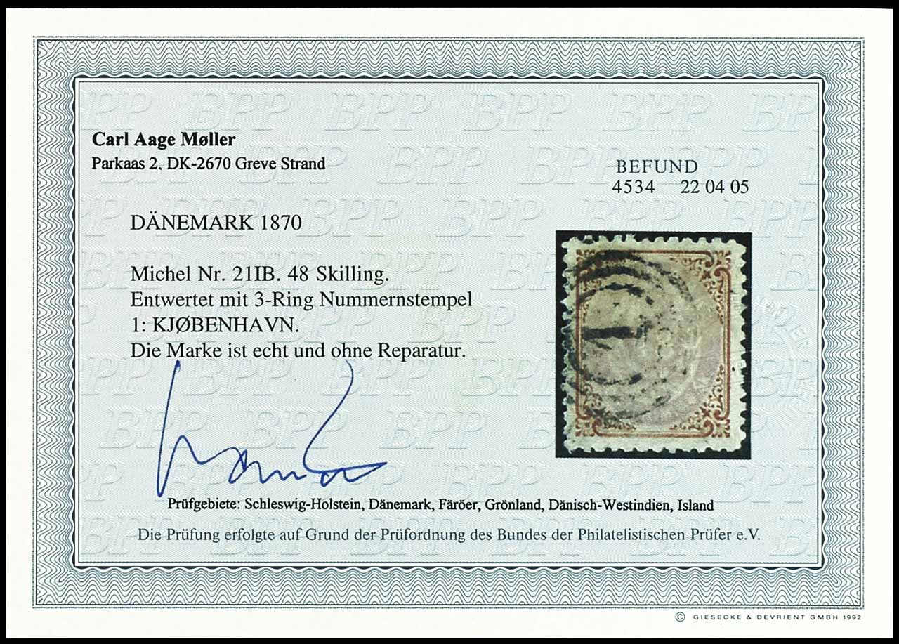 48 S brown / purple, clearly cancelled with a 3-ring postmark "1" from Copenhagen, flawless, genuine and impeccable, photographic evidence by Aage Moeller BPP.