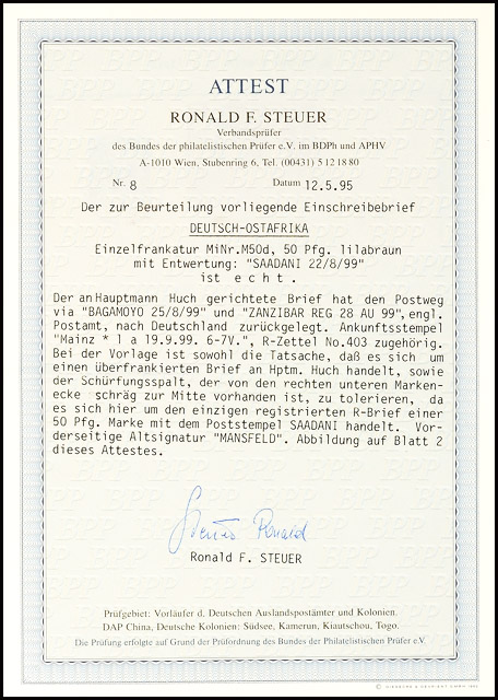 50 Pfg crown / eagle lilac brown, single franking on registered cover from SAADANI 22 / 8 99 over BAGAMOYO and British post ZANZIBAR to Mainz. There it be about the only registered registered cover the 50 Pfg-stamp from Saadani act, should a postage exceeding tariff rate as well a Schürfungsspalt tolerates become, expertized Mansfeld and in detail certificate with photograph R-Steuer