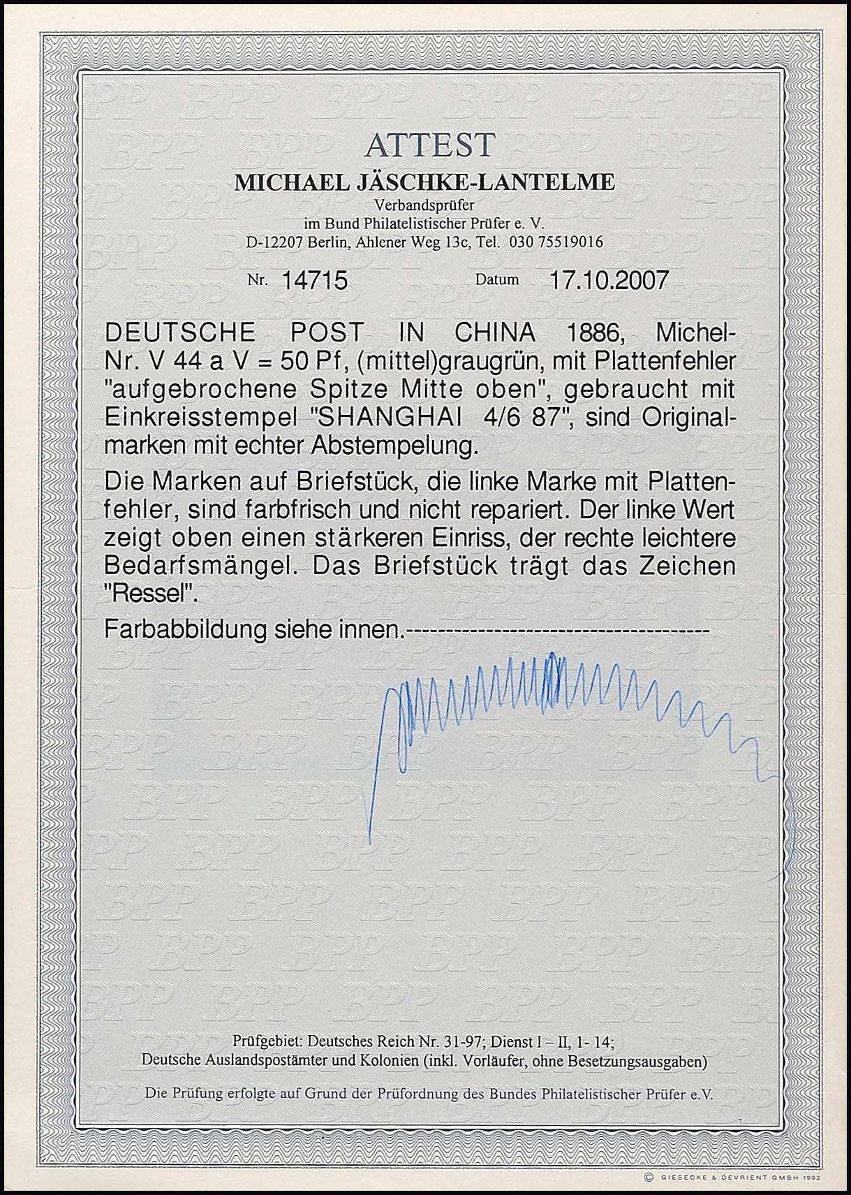 50 Pfg gray green with plate flaw V and normal stamp on commercial used on piece with postmark KDPAG SHANGHAI 4. 6. 87, stamp with plate flaw with tear, otherwise visually impressively, photo expertize Jäschke-L. BPP, 1. 080.