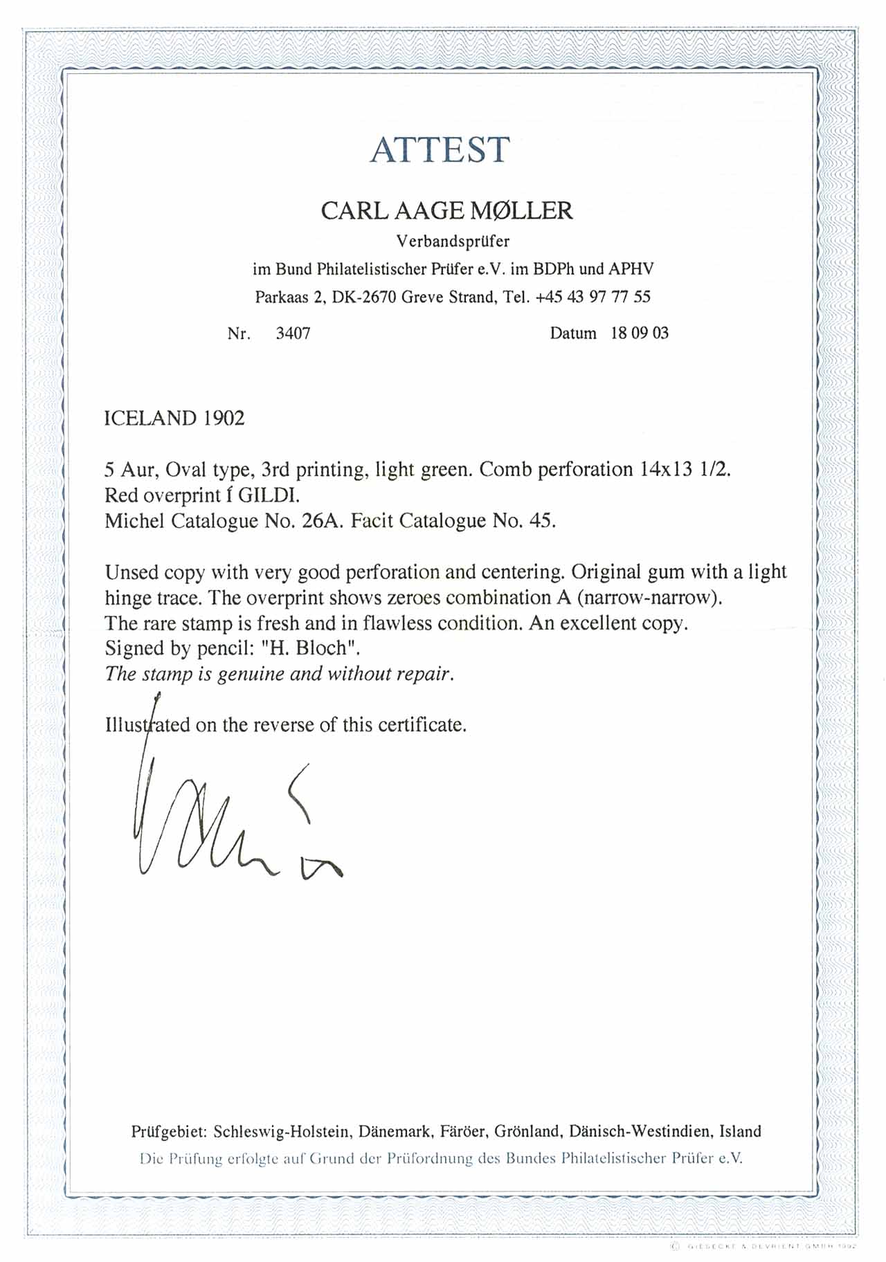 5 Aur. Postal stamp in A-perforation with red overprint "I GILDI 02 - 03", in perfect condition unused, very rare stamp, photo expertize Moeller BPP: "genuine. At excellent copy. ", Michel 1. 900.- - Facit catalogue No. 45