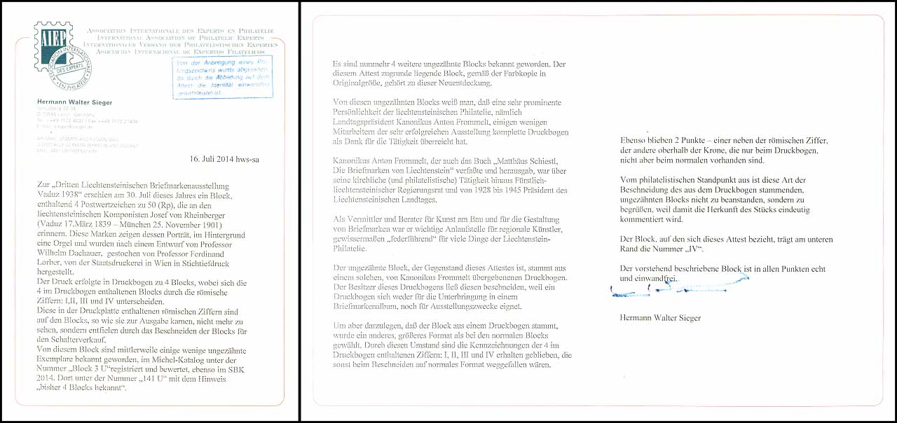 1938, souvenir sheet "Liechtenstein stamp exhibition, Vaduz", variety "unperforated", in perfect condition mint never hinged, detailed photo expertize Sieger International Association for Philatelie Experts: "genuine and immaculate", Michel 17. 000.- - spectacular Liechtenstein rarity, the only in small number of pieces have become known is! Photo see title this catalogue!