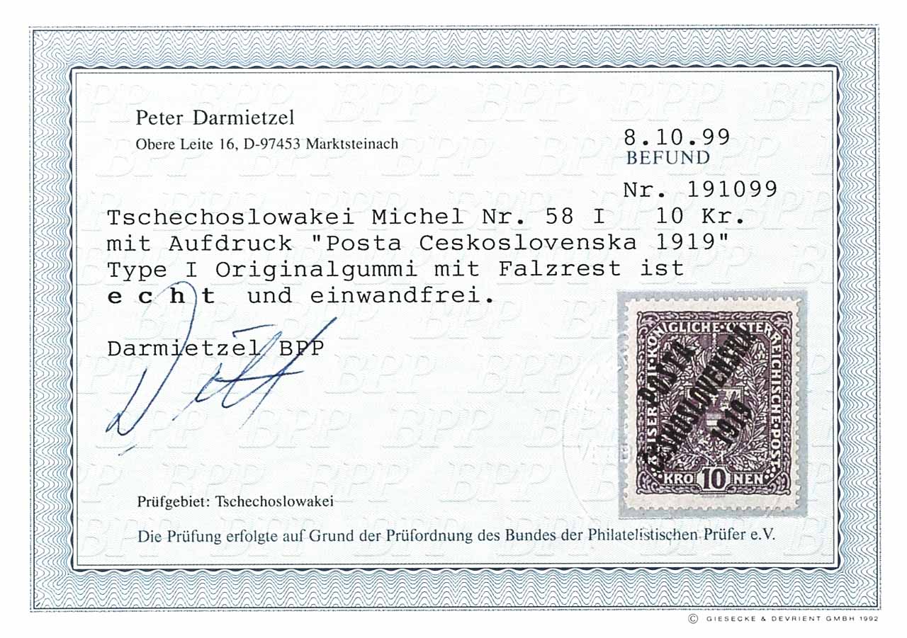 10 coronas postal stamp with overprint "Posta Ceskoslovenska 1919", type I, in perfect condition unused, photo expertize Darmietzel, Michel for ** 280.-