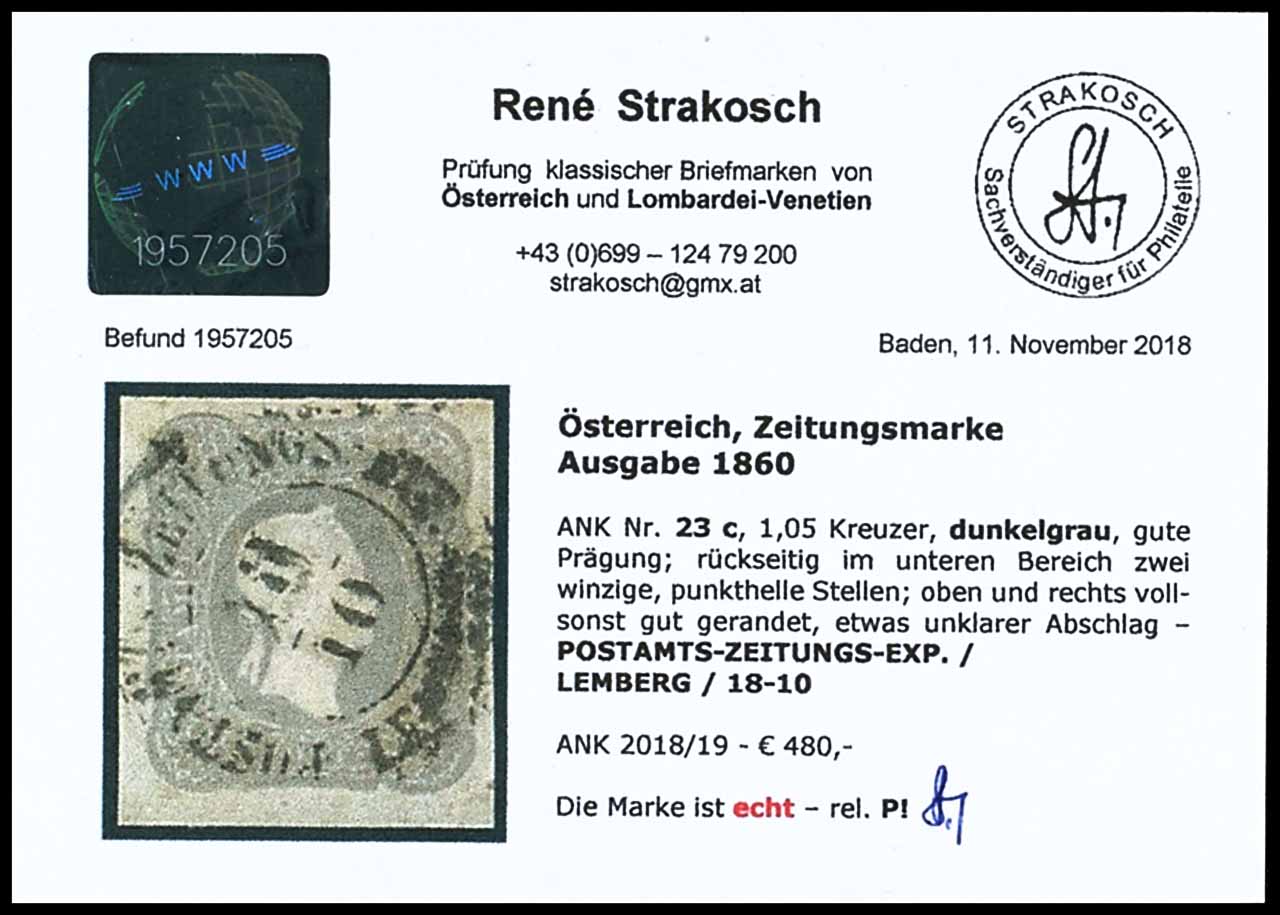 1, 05 Kreuzer newspaper stamp 1860, emperor head to the right without indication of value, embossed printing, ANK number 23 c, dark gray, good embossment, in the lower area two little thins, cancelled by partial cancel of a dual circuit cancel "post office newspaper EXPED. / Lviv 18-10", on all sides piece with full margins, fresh colours, signed, photo expertize Dr. Ulrich Ferchenbauer VOEB (1993), ANK 480.-