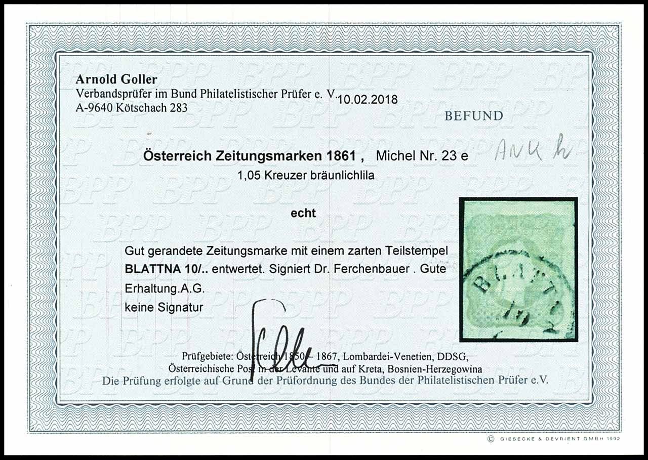 1, 05 Kreuzer newspaper stamp 1860, emperor head to the right without indication of value, embossed printing, ANK number 23 h, brownish lilac, cancelled by part of cancellation "BLATTNA 10 / . ", on all sides piece with full margins, fresh colours, expertized Dr. Ferchenbauer, photo expertize Arnold Goller BPP (2018) "good condition", ANK 380.-