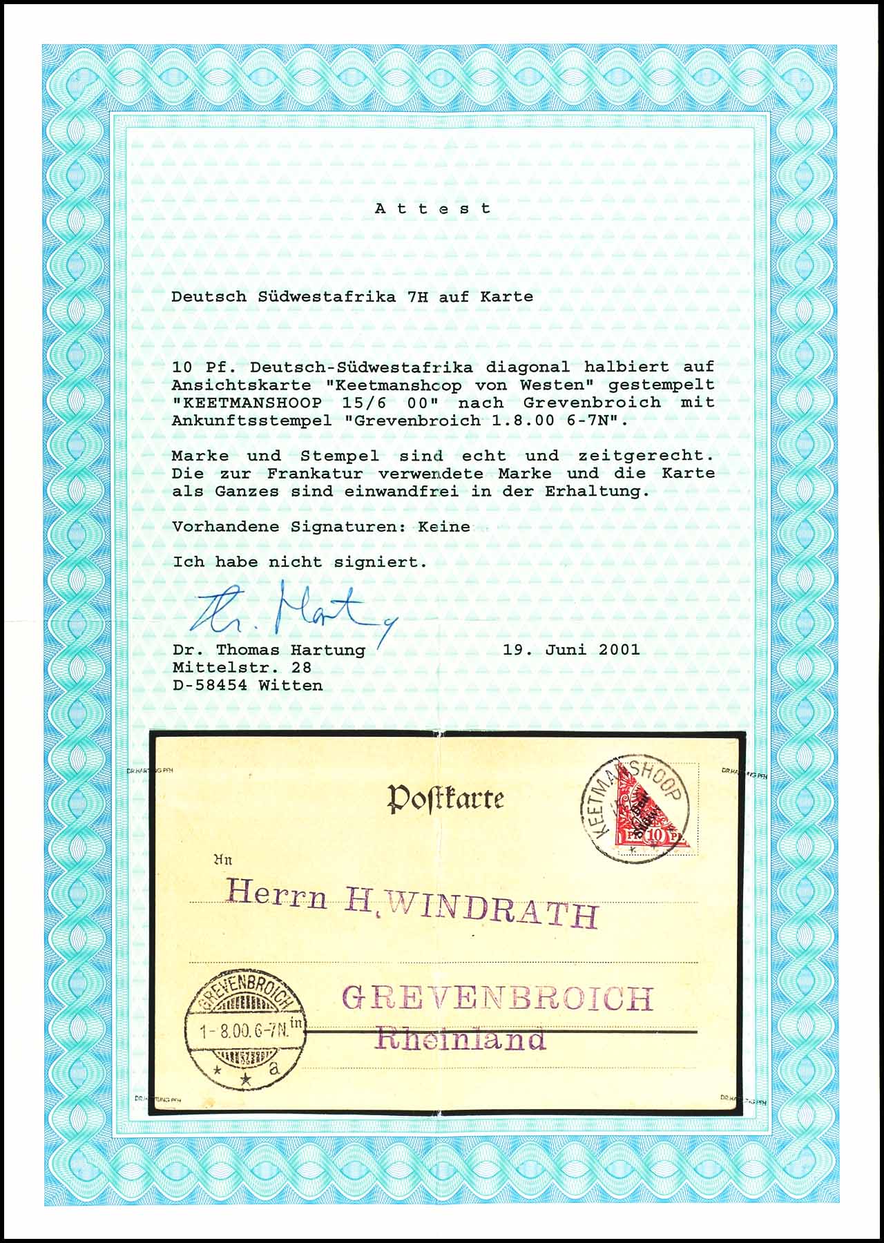 10 pfennigs crown / eagle with overprint" German Southwest Africa" halved, right upper half, cancelled" KEETMANSHOOP 2 8 00 ", tariff correct franking on picture postcard intra-colonial to Gibeon used with arrival postmark from 8.8.00, essential less frequently than to Germany used cards, very fine, signed Bothe BPP (double) and photo expertize Roland Meiners BPP "defects are indistinguishable. ", Michel 1.200.- (former starting price 250)