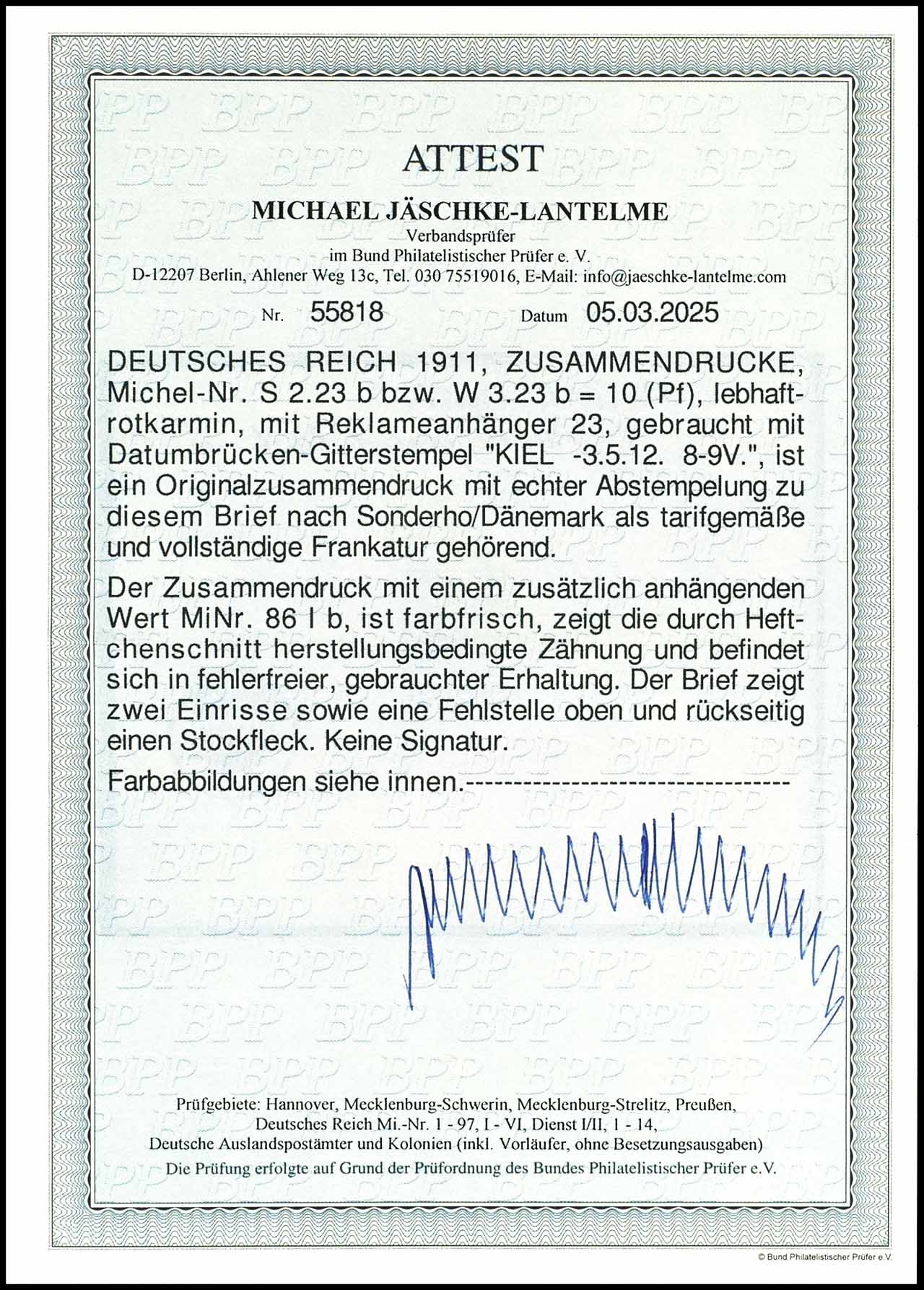 Germania 1911 / 12, 10 pfennigs bright red carmine with advertisement label 23 and an additional attached 10 pfennigs, vertical se-tenant as properly franking on cover with cancellation through date bridges grid cancel "KIEL -3.5.12 8-9 V" to Sonderho in Denmark with arrival postmark on the back of the same date, cover two tears as well defect above and reverse mould stain, franking sound with manufactured perforation through booklet cut, photo expertize Michael Jaeschke Lantelme BPP (2025), Michel 1.600.-