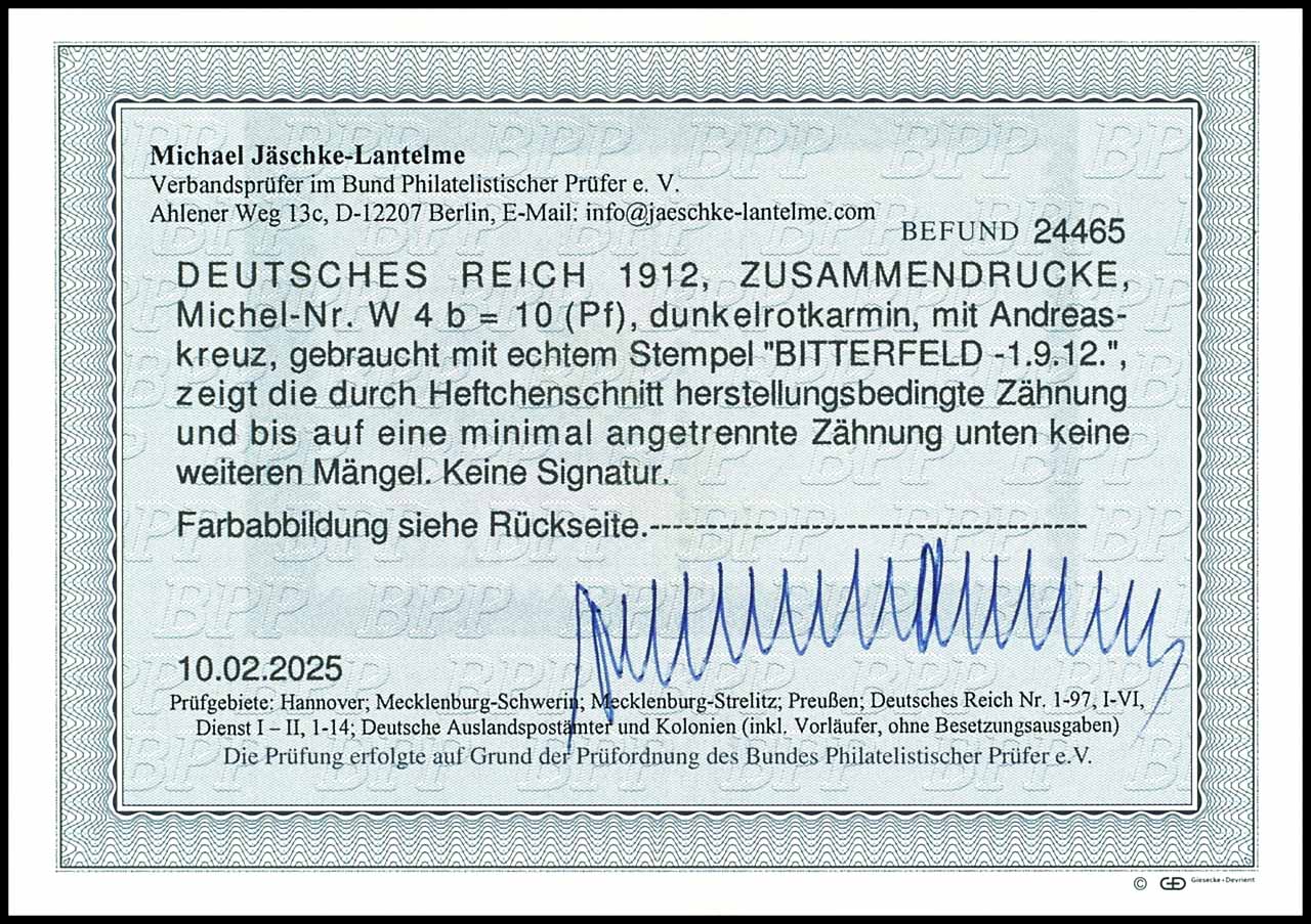 Germania 1912, X plus 10 pfennigs dark red crimson, horizontal se-tenant, cancelled "BITTERFELD -1.9.12", minimal separated perforation at the bottom, otherwise pristine, photo expertize Michael Jaeschke Lantelme BPP (2025), Michel 450.-