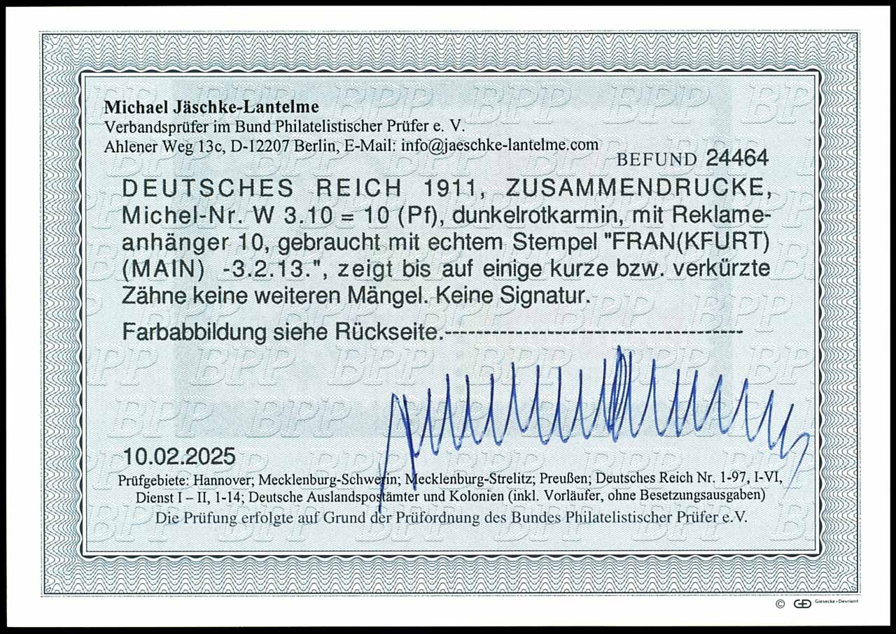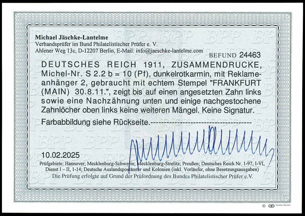 Germania 1911 / 12, advertisement label 2 plus 10 pfennigs dark red crimson, vertical se-tenant, cancelled "FRANKFURT (MAIN) 30.8.11", various repairs as well at the bottom reperforated and partly reperforated perforation, visually attrative piece of evidence for the rarely se-tenant, photo expertize Michael Jaeschke Lantelme BPP (2025)