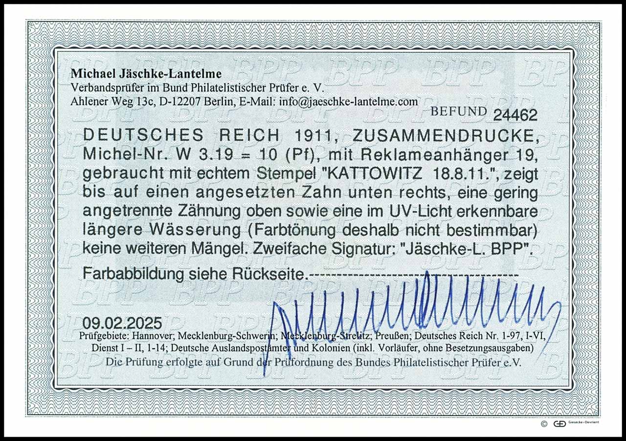 Germania 1911 / 12, advertisement label 19 plus 10 pfennigs, horizontal se-tenant, cancelled "Katowice 18.8.11", added perf and separated perforation, a little bit longer watered (under UV visible, therefore edition non-determinable), photo expertize Michael Jaeschke Lantelme BPP (2025), Michel 600.-