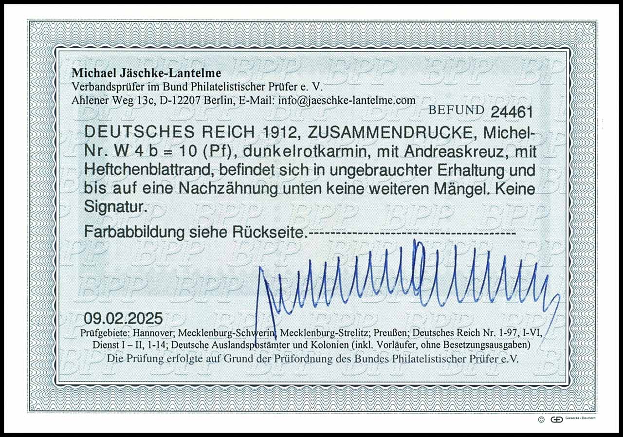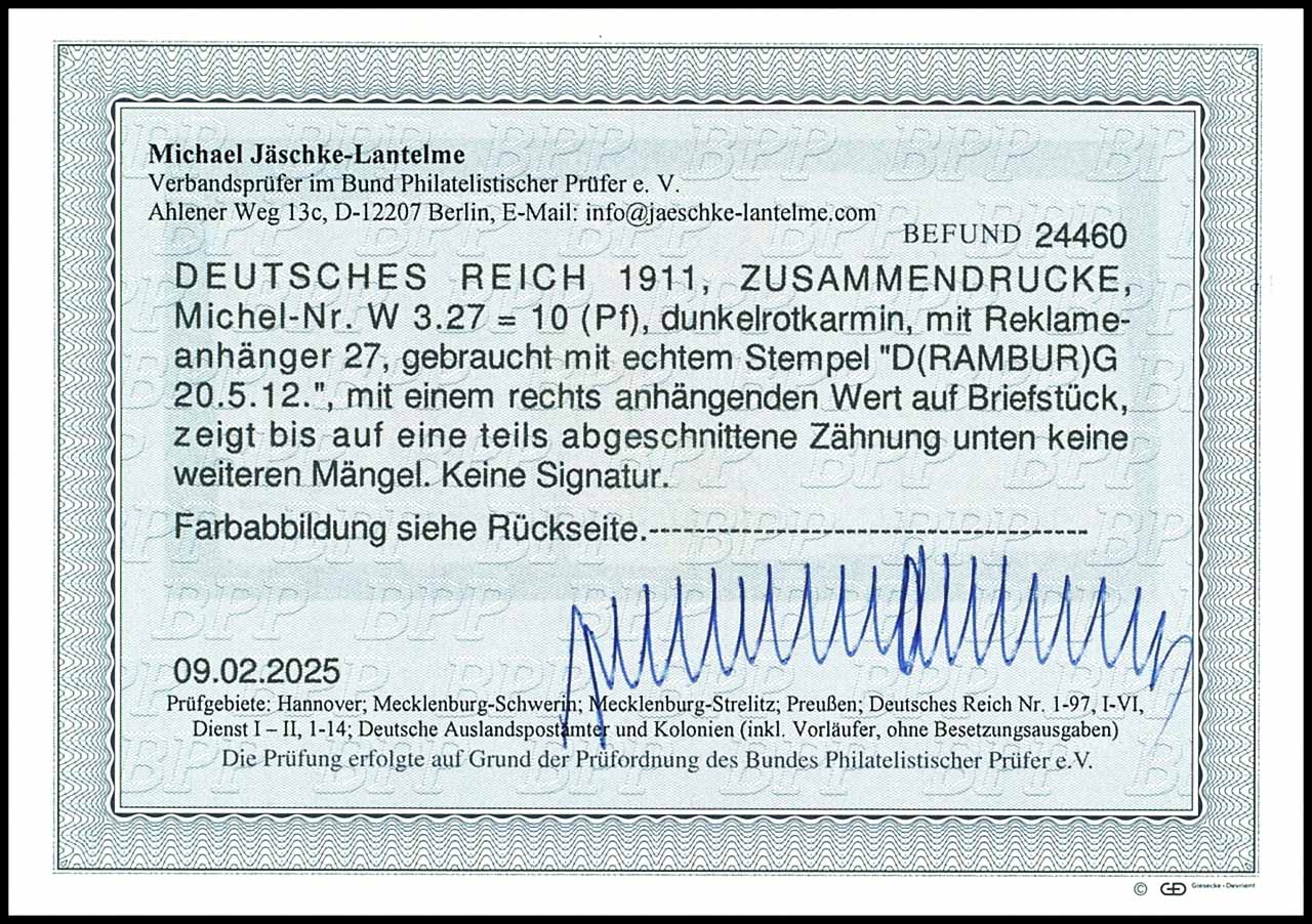 Germania 1912, X plus 10 pfennigs dark red crimson, from left margin of sheet with part house order number (H 31) 95.12, horizontal se-tenant, cancelled "M. 20.9.13", except for a shortened perf right sound, photo expertize Michael Jaeschke Lantelme BPP (2025), Michel 750.-