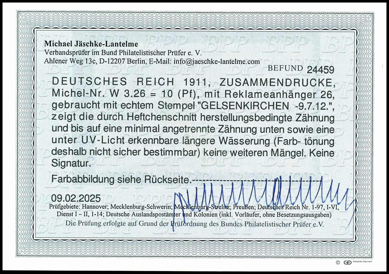 Germania 1911 / 12, advertisement label 26 plus 10 pfennigs, horizontal se-tenant, cancelled "GELSENKIRCHEN -9.7.12", minimal separated perforation at the bottom, longer ditching (only under UV visible, therefore edition non-determinable), photo expertize Michael Jaeschke Lantelme BPP (2025), Michel 650.-