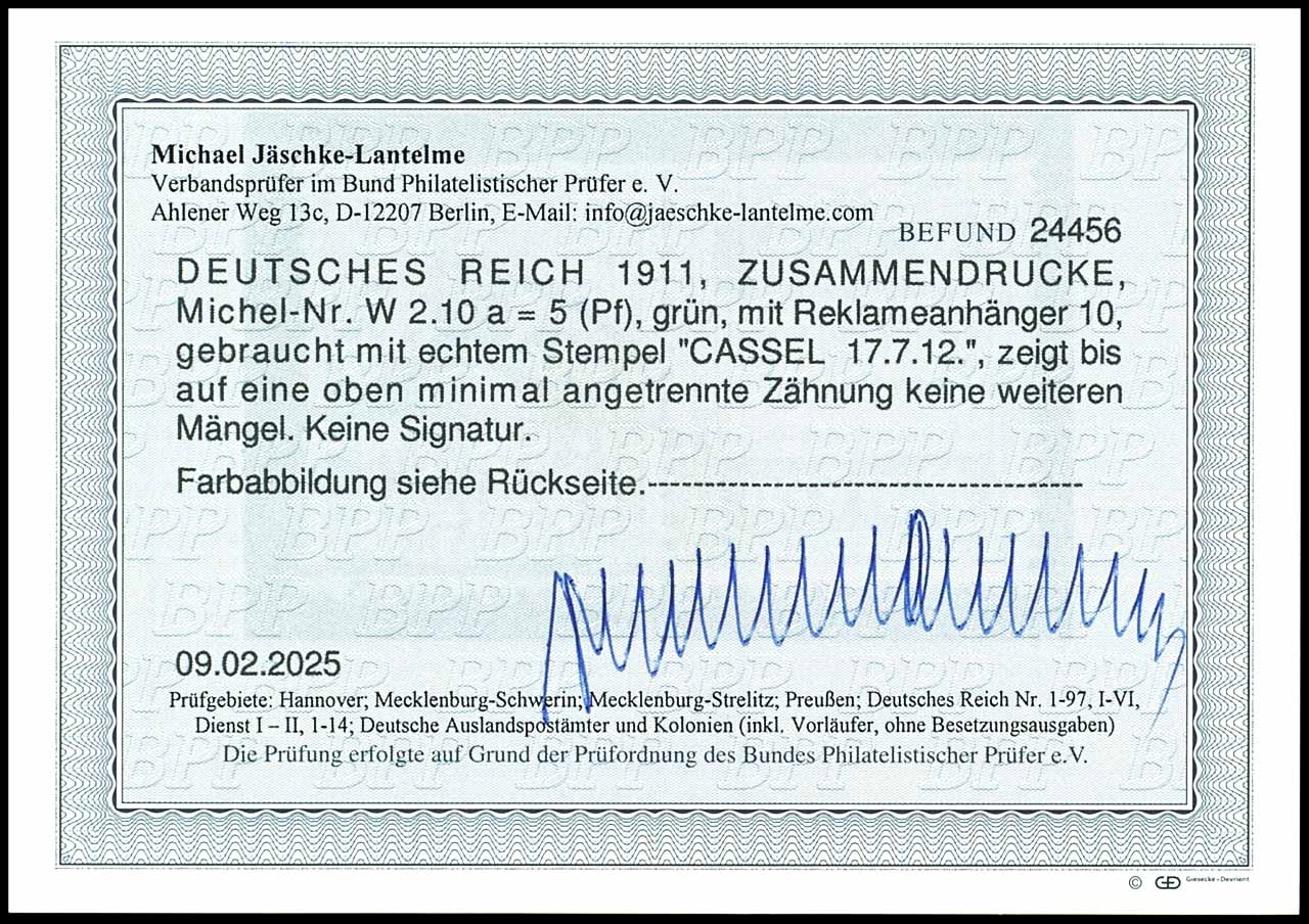 Germania 1911 / 12, advertisement label 10 plus 5 pfennigs green, horizontal se-tenant, cancelled "CASSEL 17.7.12", above minimal separated perforation, otherwise pristine, photo expertize Michael Jaeschke Lantelme BPP (2025), Michel 280.-