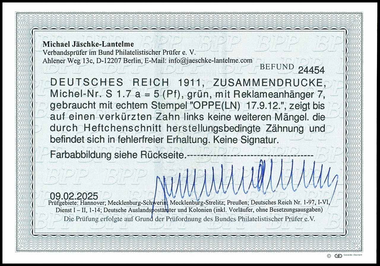 Germania 1911 / 12, advertisement label 7 plus 5 pfennigs green, vertical se-tenant, cancelled "Opole 17.9.12", apart from a shortened perf left in perfect condition, photo expertize Michael Jaeschke Lantelme BPP (2025), Michel 500.-