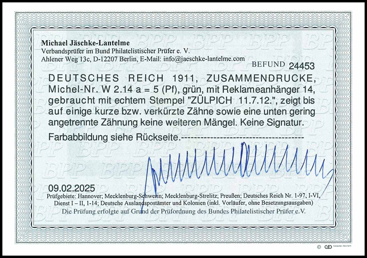 Germania 1911 / 12, advertisement label 14 plus 5 pfennigs green, horizontal se-tenant, cancelled "ZUELPICH 11.7.12", a short respectively shorter perforation as well perforation at the bottom little separated, photo expertize Michael Jaeschke Lantelme BPP (2025), Michel 600.-