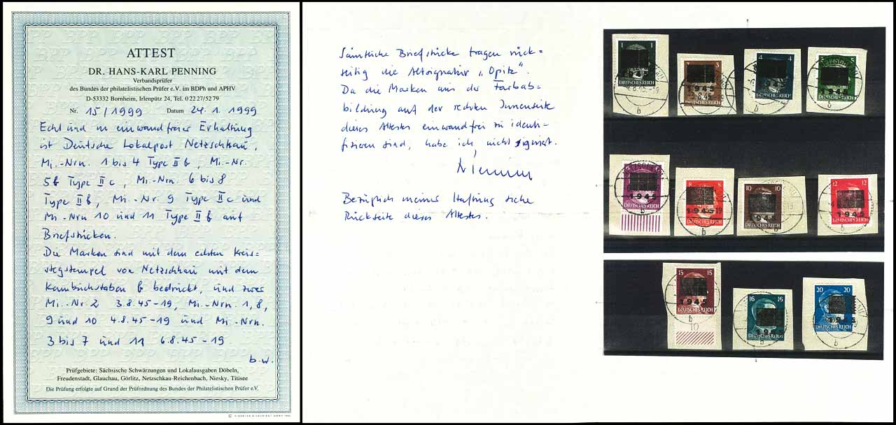 1 to 20 pfennigs permanent issue Adolf Hitler with black typography overprint, German local mail in Netzschkau Reichenbach (Saxony), in each case used on small letter pieces, Michel number 1-4 in type IIb, Michel number 5 b in type IIc, Michel number 6-8 in type IIb, Michel number 9 in type IIc and Michel number 10-11 in type IIb, sound, expertized Opitz, certificate Dr. Hans Karl Penning BPP (1999) "genuine and immaculate", Michel 1.600.- plus