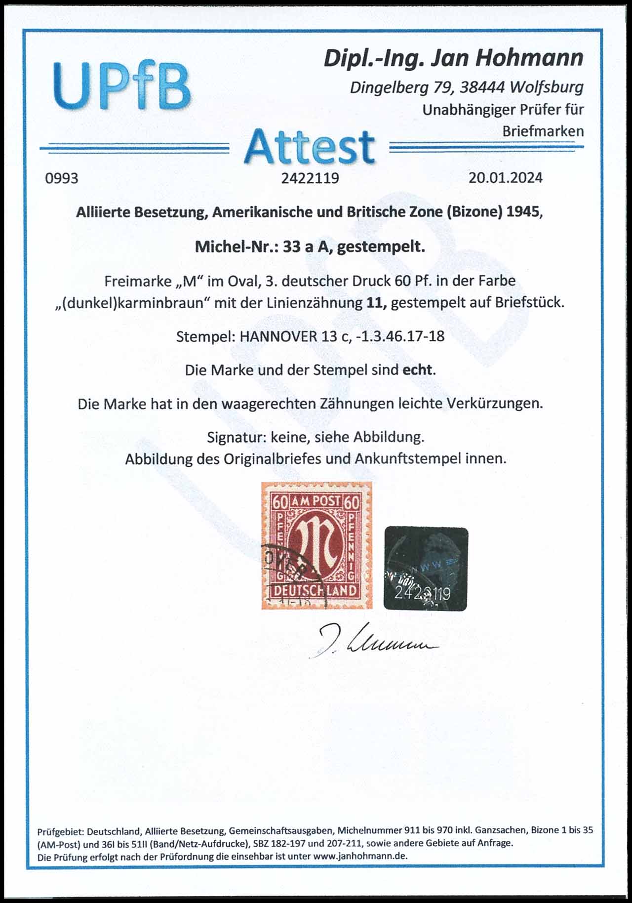 60 pfennigs first issue of stamps for Germany after WW II., perforation A, colour a, neat on small letter piece, cancelled by cancel "Hanover 13 c -1.3.46 17-18", the horizontal perforations shows slight shortenings, certificate certificate -engineer Jan Hohmann UPf B (2024), Michel 1.200.-